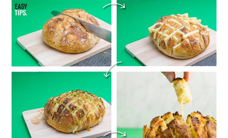 2PEYNİRLİ BİR DOKUNUŞMükemmel bir atıştırmalık! Ekmeği karnından kesin ve içine dilediğiniz bir dolgu ile bolca eski kaşar rendesi ve zeytinyağı koyun. 220°C fırına atın. Peynir eriyince çıkarın. Doyumsuz bir lezzet!